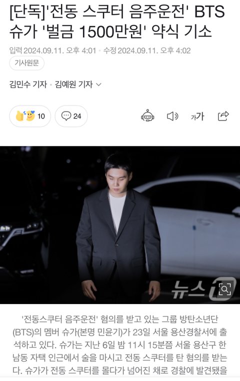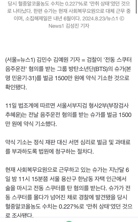 방탄 슈가 벌금 1500만원으로 기소됐대