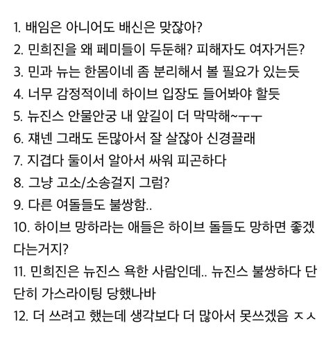 하니 인사 무시하라 한것도 민희진이 짠 계획임? 뉴진스를 향한 뉴프티언플이랑, 개인정보 유출도 민희진 계획임? 신우석한테 뉴진스 관련 영상 다 내리라고 한것도 민희진이 시킨거임? 왜 하이브가 먼저 저지른 추잡한 짓은 생각안하고 그거에 대응하는 민희진 뉴진스만 이상한 사람 취급함? 진짜 웃기지도 않음. 치졸하고 저급하고 비인간적이고 비상식적임. 외국 멤버들이 한국 와서 저런 몰상식한 일 겪는게 한국인으로써 미안하고 창피함