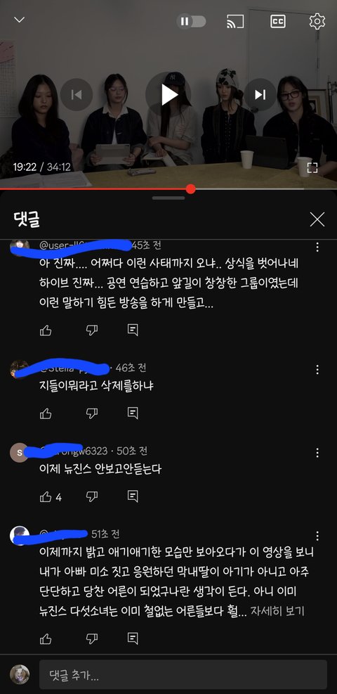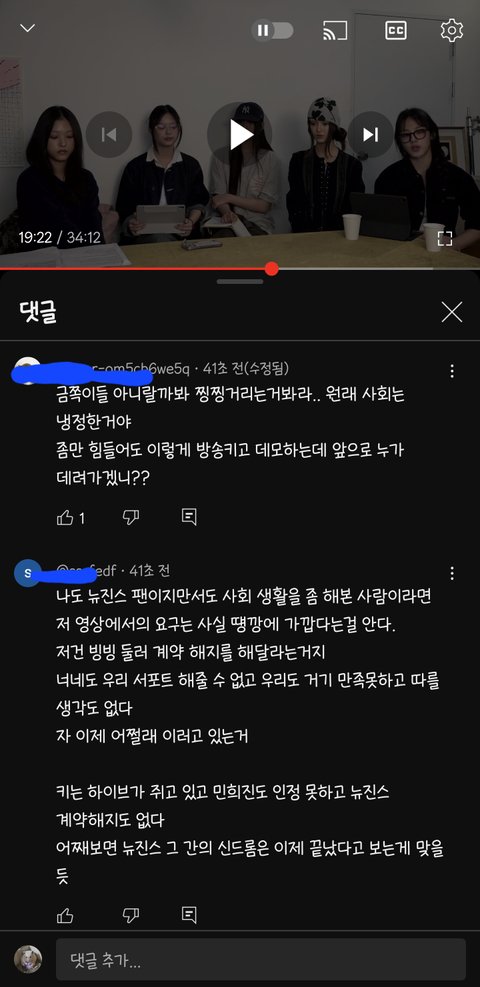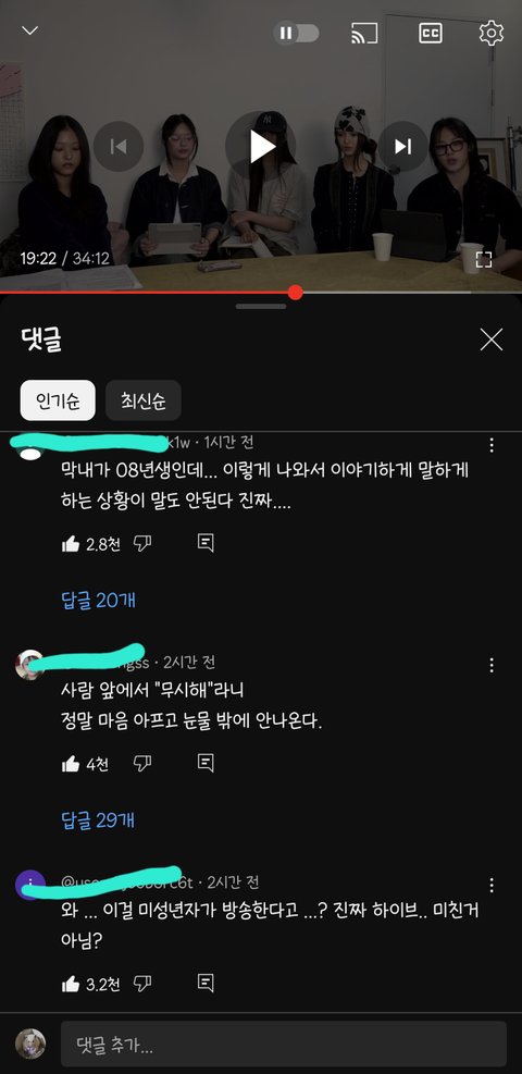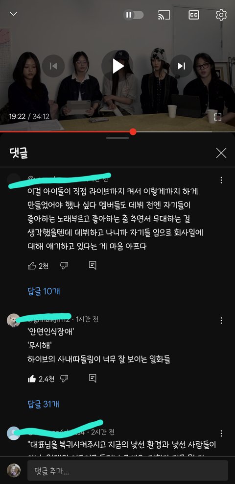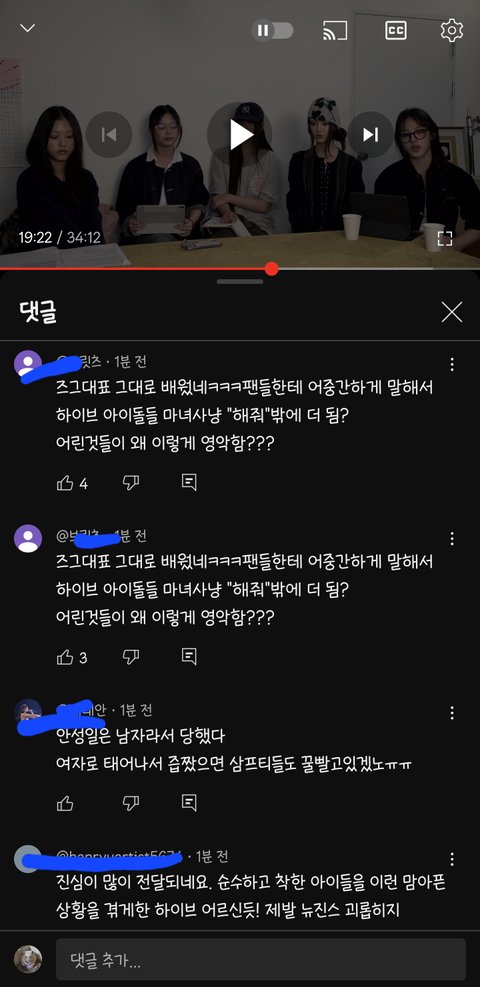 너네한테 투자한게 얼만데 말단직원이 경영진한테 해줘하고 찡찡대네 어린것들이 영악하네라는 최신순 댓글들 진짜 어떻게 이런말들을 해?? 서로 이익을 위해 계약을 했고 투자와 아티스트 보호는 당연히 해줘야 하는거고 생색낼게 아닌데 보호를 안해주고 대놓고 무시하고 심적으로 힘들게 만드는게 정상이 아니고 정말 힘들어서 어렵게 말꺼낸건데