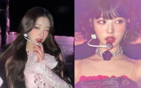 사진 속 장원영은 화려한 메이크업과 스타일링을 소화하고 있다.