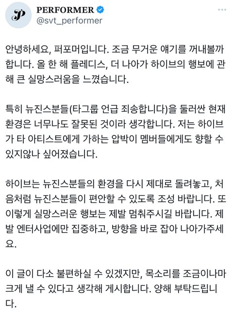 세븐틴 팬 계정 하이브 뉴진스관련 소신발언