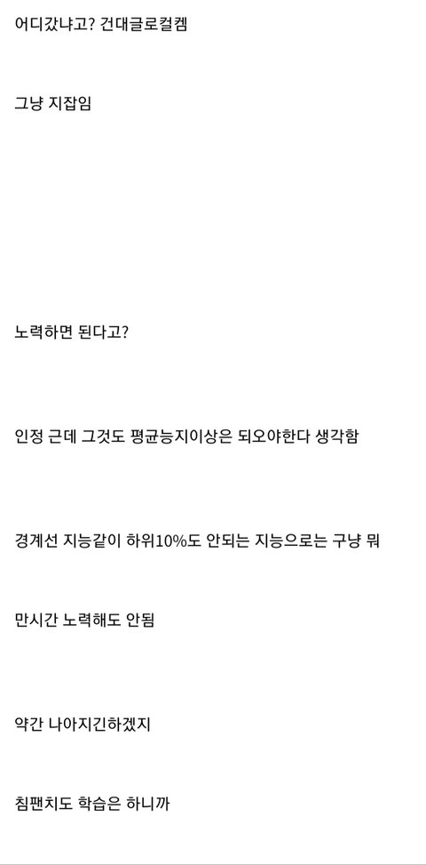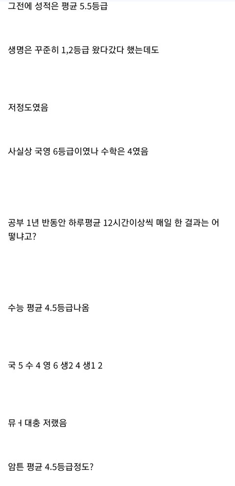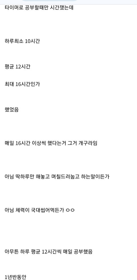 공부하는 요령을 익히고 하면 좀 낫지 않았을까? 어릴때 같은학원 다니던 애가 하루에 열몇시간씩 공부해도 평균 70점대여서 늦게 공부 시작한 내가 90점대 나오니까 나 엄청 따돌렸었는데 성적 듣고 화도 안나더라. 근데 걔는 핵심내용이 아니라 별 중요하지도 않은 부분 토씨하나 안 틀리고 달달달 외우느라 고생하던데... 이상한부분을 엄청오래열심히 공부함. 지능 문제일수도 있지만 요령문제일수도 있다고 봄