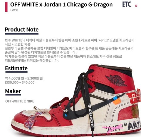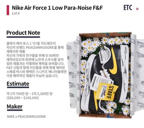 역대 나이키 Sotheby's 신발 역대 1위 경매가가 티파니x나이키 f&f버전 $40,000이었는데 이번 지디 파라노이즈가 훨씬 높음