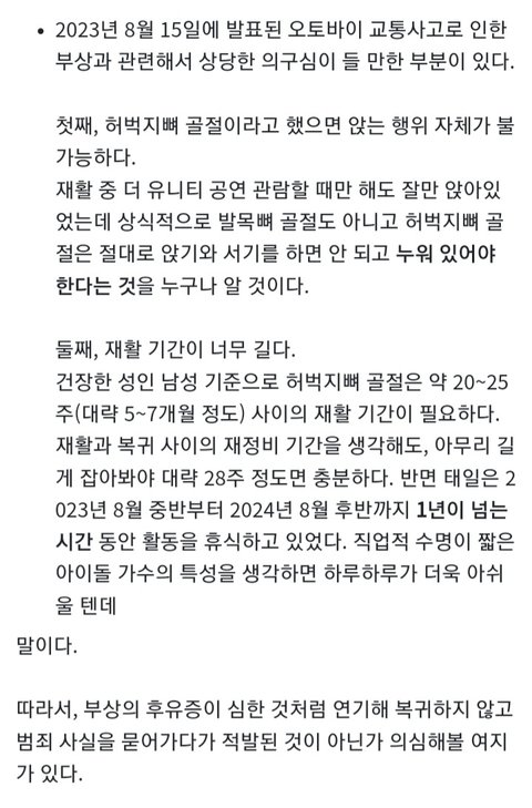 이건 너무 억까임 ㅋㅋ 엘범 포토사진에 부상당한 쪽 사진 유출된적있는데 팬들도 그때 걱정했었음 그리고 재활기간은 저렇게 되도 춤자체를 추는건 무리가 있긴하지