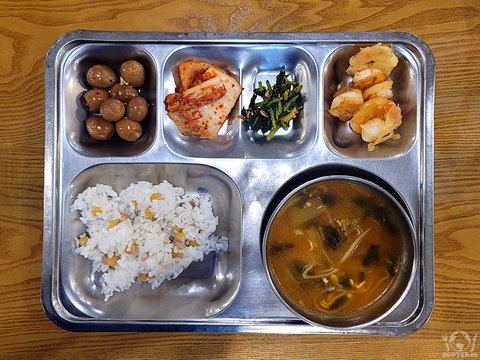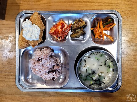 왕새우전, 잡곡밥, 사골우거지탕, 메추리알장조림, 열무막장무침, 포기김치.