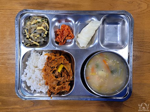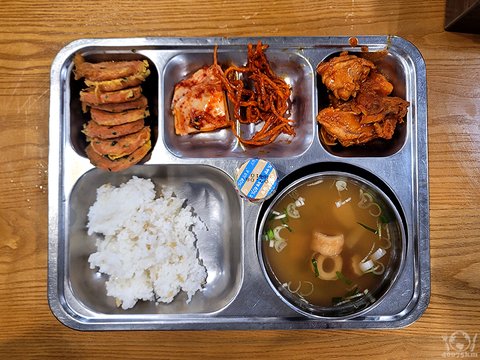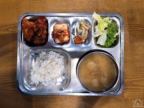 닭볶음탕, 잡곡밥, 어묵무국, 옛날소시지전, 마늘쫑진미채무침, 포기김치, 이오요구르트.