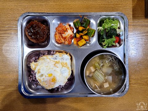 함박스테이크, 계란후라이, 잡곡밥, 소고기버섯찌개, 오이깍둑무침, 치즈토마토그린샐러드, 포기김치.