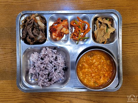 철판제육고추장불고기, 잡곡밥, 멸치감자수제비, 청포묵지단채무침, 양배추쌈, 포기김치.