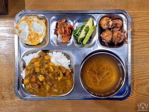 소고기카레라이스, 콩나물맑은국, 계란후라이, 타코야끼, 사과참나물그린샐러드, 포기김치.