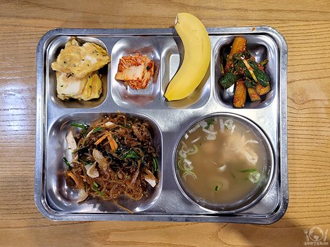 돈육잡채, 잡곡밥, 닭곰탕, 두부계란구이, 당근오이소박이, 포기김치, 계절과일.