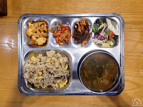 마파두부, 계란볶음밥, 근대콩나물국, 멸치캐슈넛볶음, 토마토시저샐러드, 꼬시래기양배추무침, 포기김치.