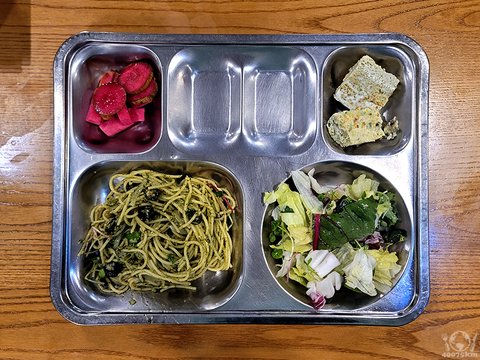 바질오일파스타, 잡곡밥, 콩나물김치국, 야채계란찜, 양상추샐러드, 수제오이피클.