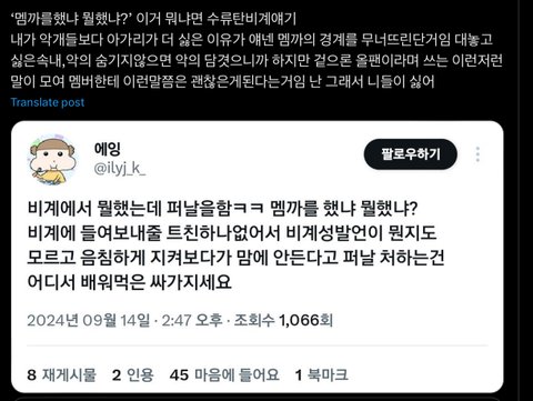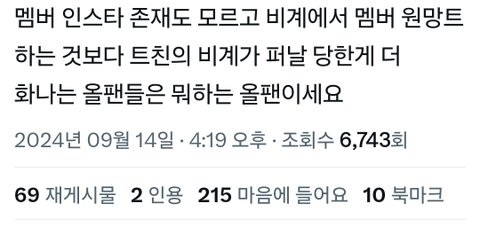 멤까의 경계를 무너뜨린다ㄹㅇ ㅇㅈ 퍼날한 애도 웃기지만 ㅅㄹㅌ 쉴드 치는 애들도 ㅈㄴ 웃김ㅋㅋ 만약 악개들이였어봐;; 걍 멤까하는 애들은 똑같은 취급해야 되는데 올팬이라하면 봐줌ㅅㅂㅋㅋㅋㅋㅋ