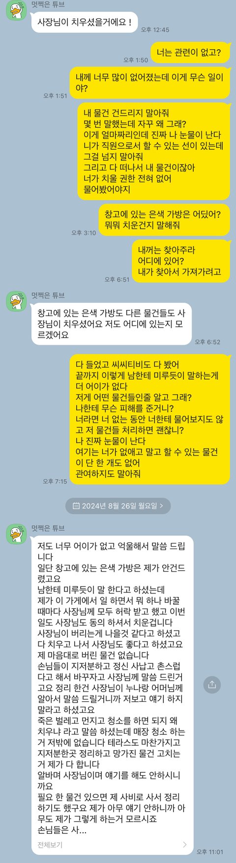 제가 상황 파악을 하고 그 직원한테 톡을 넣으니 한참 후에 직원이 "사장님이 치우셨을거에요 !" 이렇게 딱 한 마디 오더라고요. 그러고서는 동생이 먼저 버리자고 했다며 말을 바꿔서 톡을 보냈고요. 직원과 나눈 대화 첨부합니다.