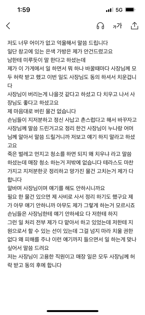 그동안 이런 직원은 한 명도 못 봐서 도대체 무슨 마음으로 그런건지 동생이 물러터진 성격이라 마음대로 해도 된다고 생각한건지 그렇다고 해서 멀쩡히 주인이 있는걸 아무런 말도 없이, 몰래, 이렇게나 많은 양을 다 버릴 수가 있는건지 도저히 이해가 안됩니다.