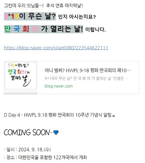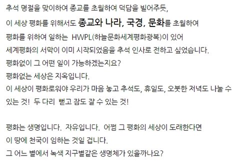 'HWPL로 인해 세계는 평화를 말하기 시작했다''오직 평화만을 목적으로 일하는 평화단체는 전 세계서HWPL뿐 ^*^ 이것은 HWPL의 자랑이 아니요,온 세상 만민을 위한 자랑이 될 것입니다. 오라 ~! 평화여~! 하늘의 별들의 수만큼, 이 땅에도 수많은 사람들이평화를 기다리며 빛되어 평화를 위해 일하고 있다는 것을!평화의 꽃을 피우고 있다는 것을~!결국, 마침내, 이윽고, 드디어 그토록 염원하던 평화가열매를 맺는 날이 다다르고 있다는 것을 아는 사람의 마음은 얼마나 행복한 가를! 우리 추석 인사말, 추석 명절 인사말, 추석 인사로"평화해요 ~~"