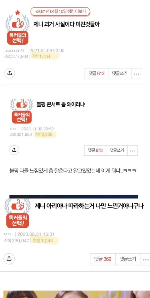 블핑 - 온갖 성희롱에 소속사 대표랑 말도안되는 스캔들로 루머유포 당하고 여초에서 보호도 못받고 그저 여초 애들도 같이 신나서 제니 성희롱하고 난리남