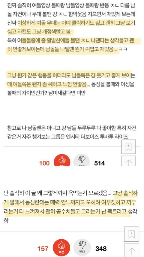 ⬇️⬇️ 얼마전에도 올라온 레전드 남미새 여적여 판녀 게시물..^^ 정상적인 커뮤라면 추천수는 개뿔 반대수만 수백개씩 쳐눌려야 정상일 글에 추천수가 무려 150개 상이 쳐눌린 레전드급 미개한 글 ㅋㅋㅋㅋㅋㅋㅋㅋ