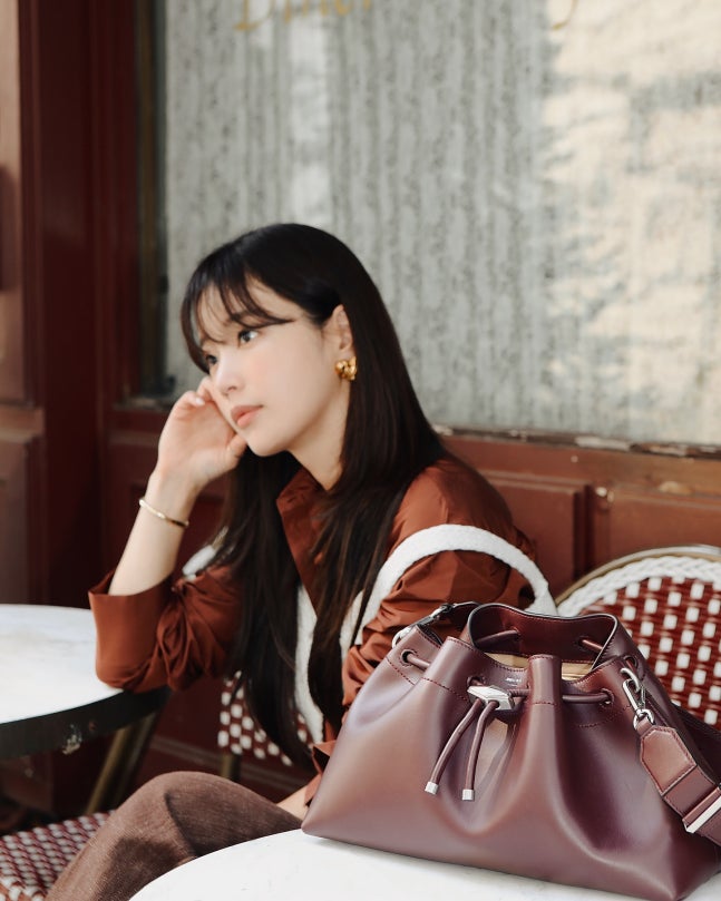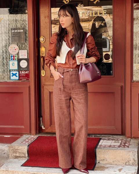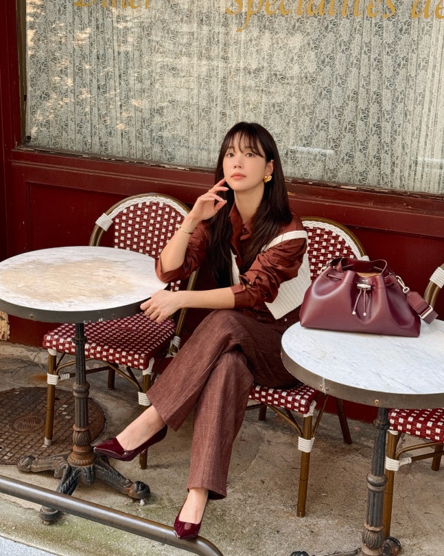 공개된 사진 속 기은세는 차분한 브라운 톤 셔츠와 팬츠를 입고, 버건디 컬러 핸드백과 하이힐을 매치해 우아하고 세련미 넘치는 스타일링을 선보였다. 여기에 아이보리 크로셰 베스트로 화사한 포인트를 얹었다.