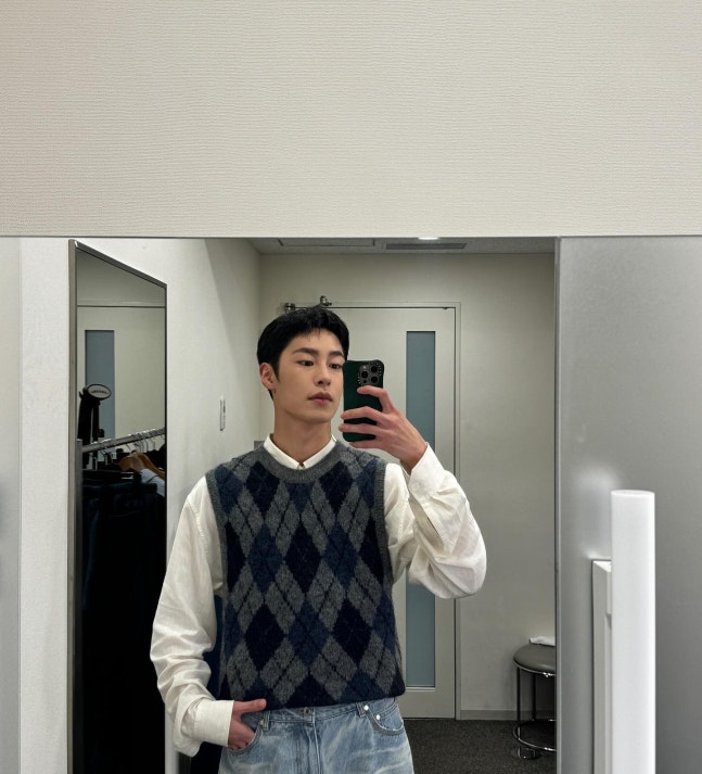 또 다른 사진에서 그는 화이트 셔츠에 아가일 니트 베스트를 더하고 데님 팬츠를 입어 캐주얼한 가을 남친룩을 완성했다.