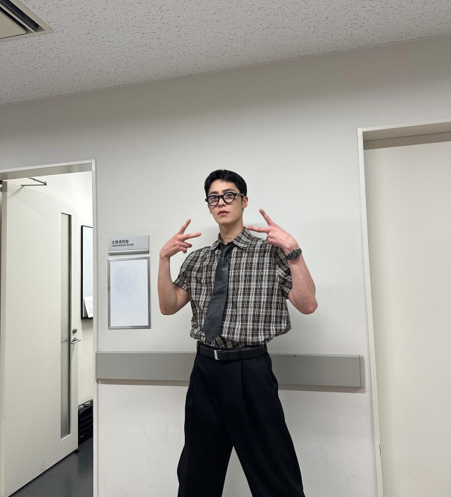 공개된 사진 속 이재욱은 브라운 톤 체크무늬 반팔 셔츠에 넥타이를 매치하고, 블랙 팬츠를 입었다. 여기에 두꺼운 뿔테안경까지 착용해 너드미 넘치는 매력을 발산했다.