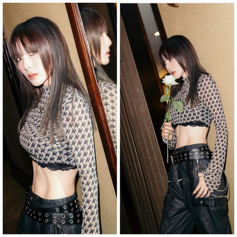 또한, 하의로는 와이드 핏의 가죽 소재 팬츠를 매치해 스트리트 감성을 더했다. 팬츠에는 벨트와 금속 장식들이 포인트로 들어가 강렬한 인상을 주었으며, 전체적인 스타일에 조화로운 디테일을 더했다. 벨트에 달린 금속 링과 체인은 모던하면서도 강렬한 느낌을 주며, 크롭탑과 조화롭게 어우러져 절제된 섹시함을 부각시켰다.특히, 산다라박이 사진 속에서 들고 있는 하얀 장미는 강렬한 패션과 대조를 이루며 그녀의 스타일에 순수함과 여성스러움을 더해주었다. 장미를 들고 있는 포즈는 부드럽고 감성적인 이미지를 강조하며, 전체적인 룩과 분위기에서 균형을 이뤄 패션에 완성도를 높였다.