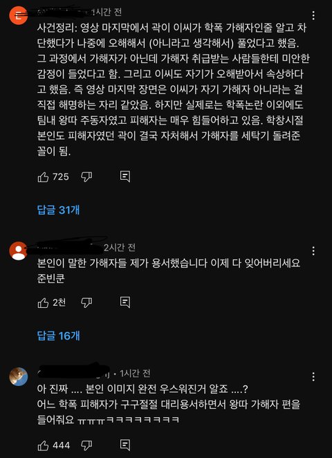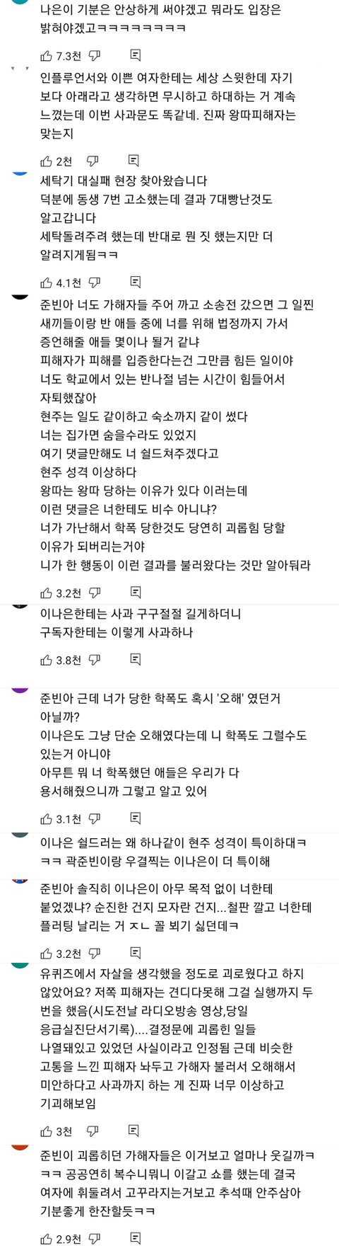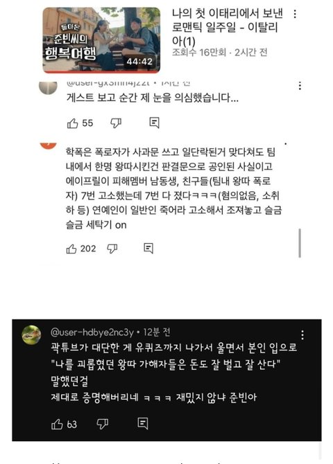 곽튜브+이나은 영상과 곽튜브 사과문에 달린 댓글들