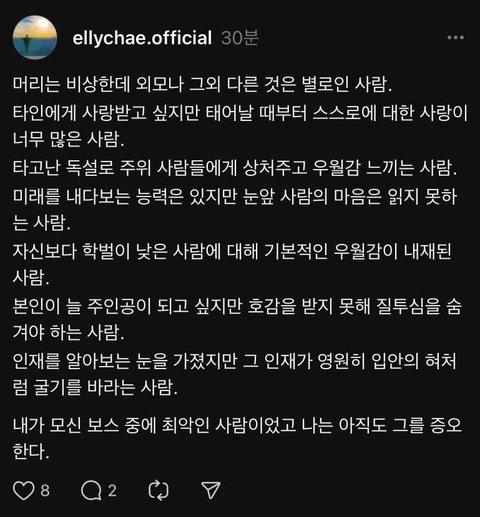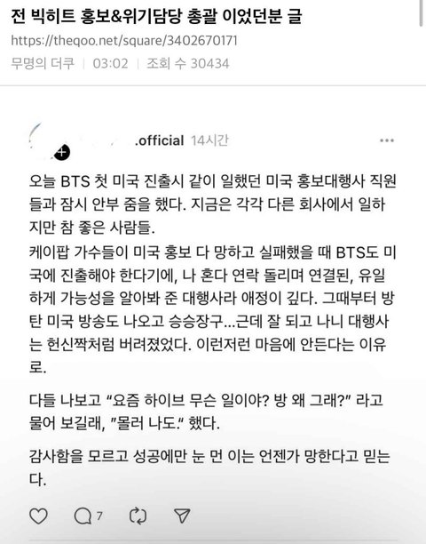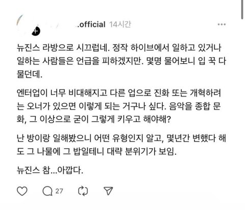 이게 맞지 .. 아니 맞을 듯.. sm에 10년 넘게 있으면서 엔터업 다 아는 사람이 이제와서 날뛰는게 말이 되겠나? 뭔가 앞뒤 다른 상황에 탈출하려 했겠지.. sm 아티스트들이 응원하는 거 보면 민이 잘못 살진 않았을 듯.. 뭐 엔터업이야 드세지 않음 버틸 수 없고 .. 방은 협업은 아니나 제안 자문구햐서 답만 얻음 팽하는 듯.. 지금 대기업으로 상장도 했겠다 자기가 군림하는 세계에서 자기 혀놀림에 죽는 시늉해야 하는데 아니라고 하니까 거슬리겠지..