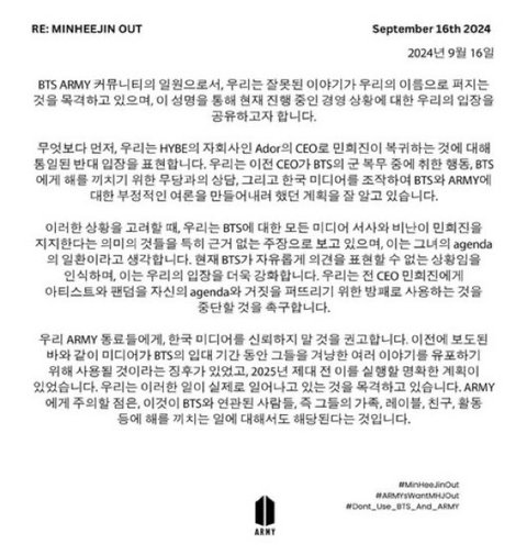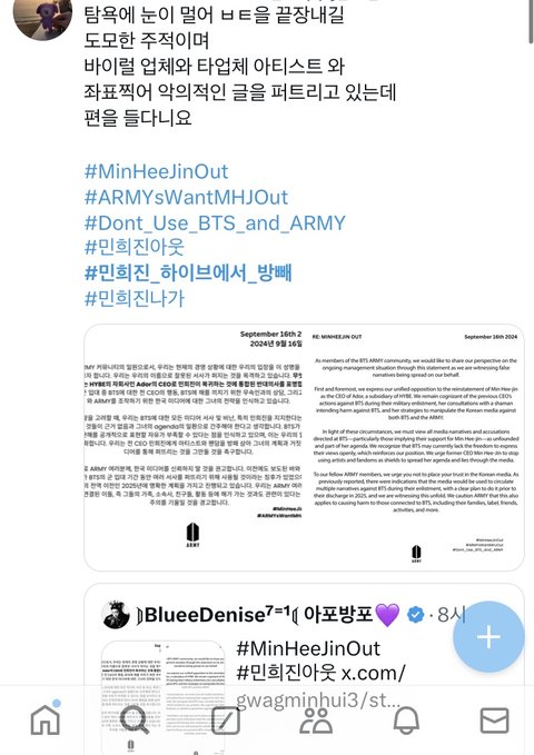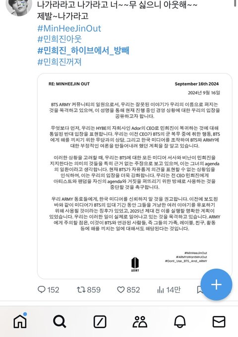 민희진이 방탄 욕한 카톡 다 까발려졌는데 방탄이 민희진을 지지할 리는 없음 게다가 정국은 방탄에 대한 애정 남다름 하이브 대주주고 단지 아티스트가 안타까운거지 자기들도 아티스트니까 확대해석해서 민희진 지지했다? 이건 진짜 아님