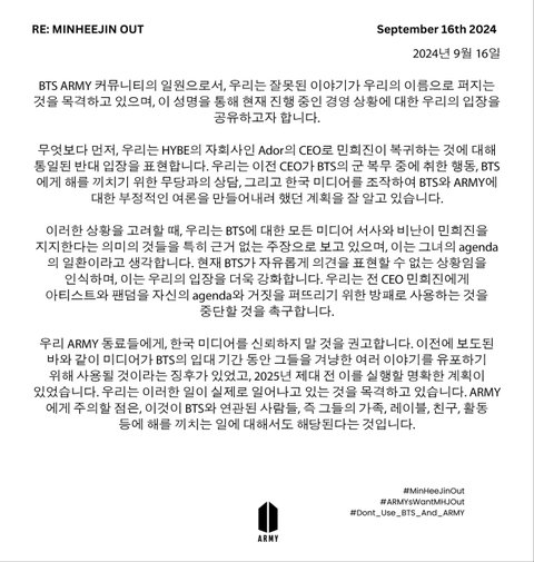 ㅅㅊ 하이브 어도어 방탄 BTS 아미 민희진 뉴진스 버니즈