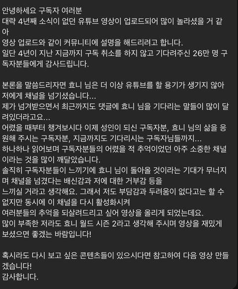 효니월드 4년 동안 잠수 탔다가 4개월 전에 영상 올라왔는데 계정 넘겼다 함ㅋㅋㅋㅋㅋㅋ 기다린 사람은 뭔 헛고생이냐고...