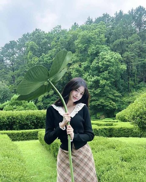 레이스가 달린 카디건에 체크무늬 롱스커트로 성숙한 분위기와 함께 슬렌더 몸매를 드러냈다.