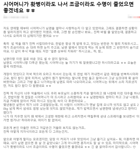 시어머니가 홧병이라도 나서 조금이라도 수명이 줄었으면 좋겠네요 ㅎㅎ