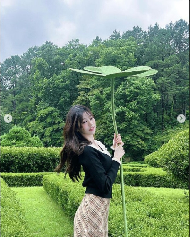 공개된 사진 속 장원영은 대형 네잎클로버를 들고 카메라 앞에 섰다.