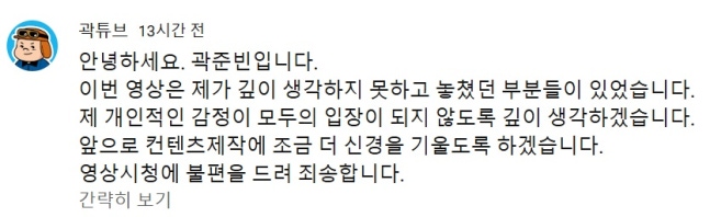 (엑스포츠뉴스 명희숙 기자) "이번 영상은 제가 깊이 생각하지 못하고 놓쳤던 부분들이 있었습니다"