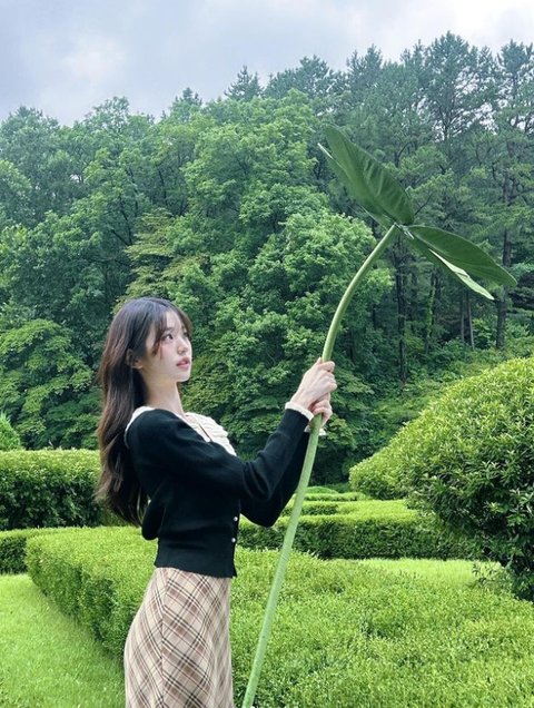 공개된 사진 속 장원영은 푸른 잔디 위에서 초대형 네잎 클로버를 손에 들고 있다. 블랙 컬러 니트에 체크무늬 스커트를 입고 청순한 매력을 뽐냈다.