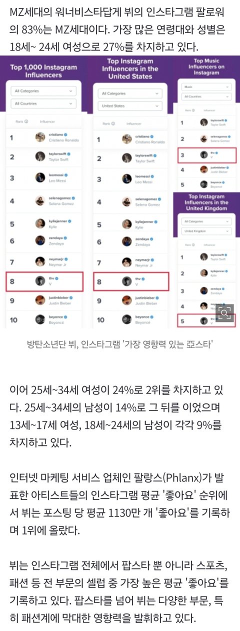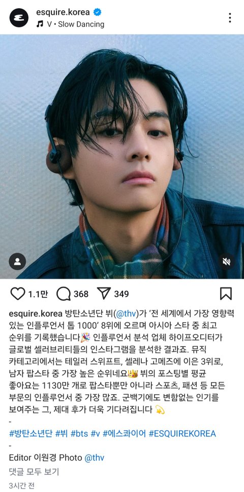 방탄소년단(BTS) 뷔가 인스타그램에서 '전 세계에서 가장 영향력 있는 아시아 스타'에 오르며 글로벌 존재감을 빛냈다.