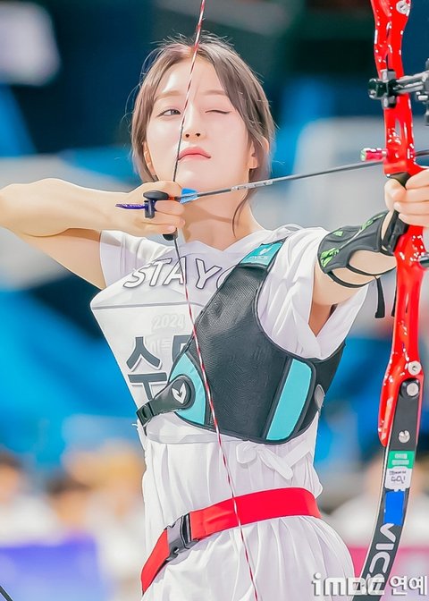 스테이씨(STAYC) 수민이 최근 경기도 고양시 고양실내체육관에서 열린 MBC '2024 추석특집 아이돌스타 선수권대회'(아육대) 녹화 방송 촬영 현장에 참석해 양궁 경기를 하고 있다.