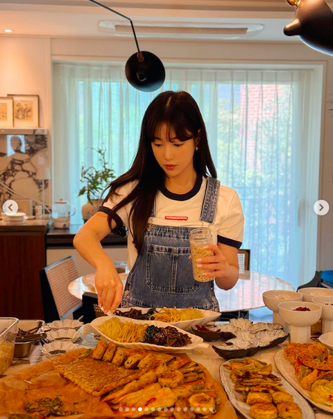 사진 속 기은세는 직접 만든 각종 나물부터 꼬치전, 동그랑땡, 산적, 갈비 등 다양한 명절 음식들을 완성했다. 평소 자신의 유튜브를 통해 수준급 요리 실력을 자랑했던 바. 고급 한식집 못지 않는 플레이팅까지 선보여 감탄을 자아냈다.