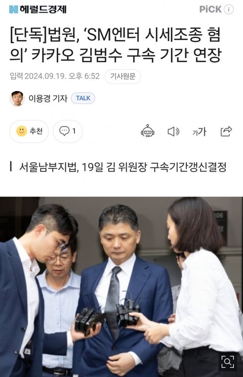 [단독]법원,'SM엔터 시세조종 혐의' 카카오 김범수 구속 기간 연장