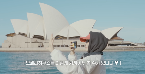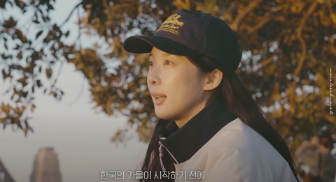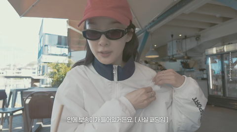 하얀색자켓에는 오히려 더 높은 채도의 모자로 얼굴색 살려줌