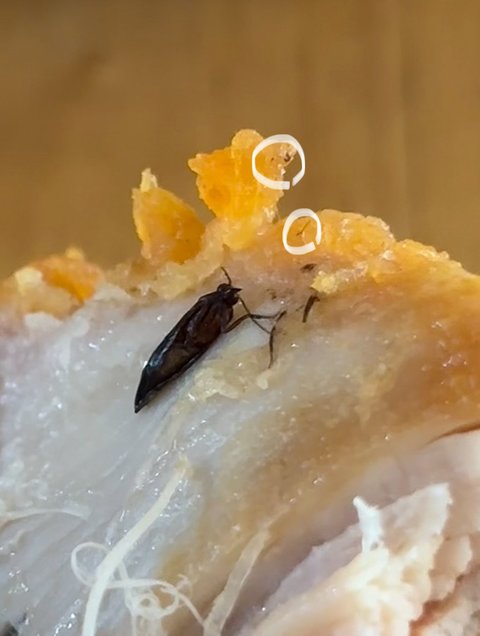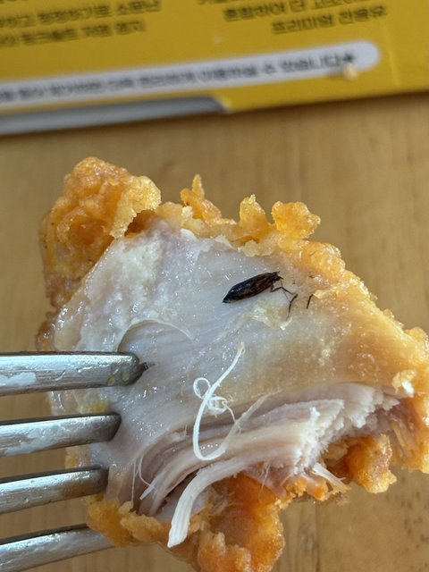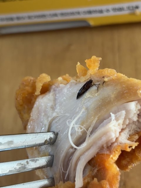 한입 베어 먹을 때 튀김옷이 벗겨졌고 그 때 바퀴벌레로 추정되는 벌레를 발견했습니다.