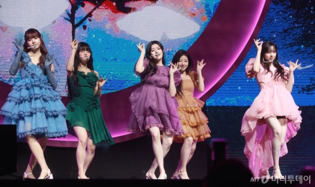 그룹 피프티피프티(FIFTY FIFTY)가 20일 오후 서울 광진구 예스24라이브홀에서 진행된 두 번째 미니 앨범 '러브 튠'(Love Tune) 발매 기념 쇼케이스에서 신곡을 선보이고 있다. /사진=이동훈 기자