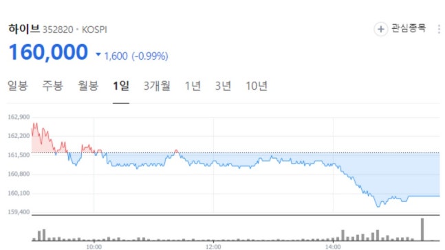 20일 기준 하이브 주가는 전일 대비 1,600원(-0.99%)한 하락한 16만 원을 기록했다. 장 중 한때 16만 원 선이 붕괴되며 15만 9,600원까지 떨어졌던 주가는 장 마감 직전 간신히 16만 원 선을 유지했다.
