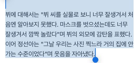 뷔는 느끼하지않고 고급지며 동안이지만 어른스럽고 부드럽고 진실이 느껴지는 얼굴임 사진,영상만 봐도 진짜 심하게 잘생겼다고 느끼는데 실제는 얼마나 잘생겼을지 감응이안감 정선아님 부러우셔요