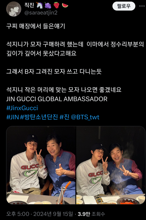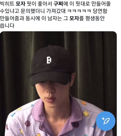 요즘 저 빅히트 모자 쓰는 이유가 웬만한 모자는 핏이 안 맞아서ㅠㅠ 머리가 너무 작아서 위가 뜬대 그래서 구찌에 따로 제작 요청했대