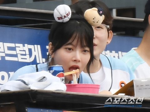 21일 서울 잠실구장에서 열린 두산-LG전. 그룹 르세라핌 멤버 은채가 두산을 응원하며 야구장 음식을 먹고 있다. /2024.9.21/