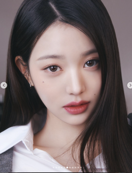 장원영 SNS또 다른 사진 속에서 장원영은, 긴 머리를 풀어 내리고, 또렷한 눈매를 강조하는 아이메이크업으로 강렬한 모습을 보였다. 볼에 있는 점과 붉은 입술 컬러가 포인트되어 신비롭고 몽환적인 분위기를 연출했다.