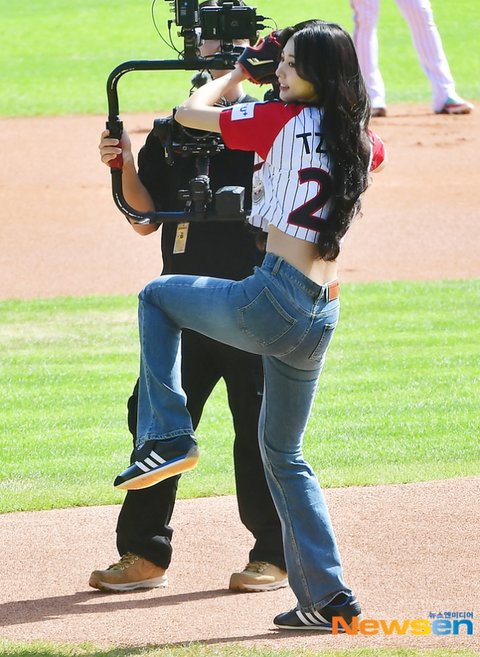 이날 경기전 시구자로 트와이스 쯔위가 시구를 하고 있다.