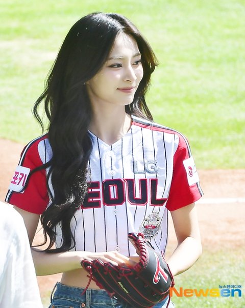 이날 경기전 시구자로 트와이스 쯔위가 시구를 하고 있다.